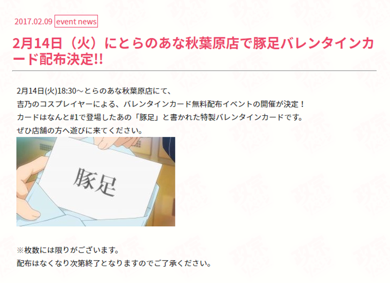 とらのあな秋葉原店にて、「小岩井吉乃」のコスプレをしたコスプレイヤーさんが、バレンタインカードを無料配布する。カードは1話で登場した「豚足」と書かれた特製バレンタインカードとなっている。